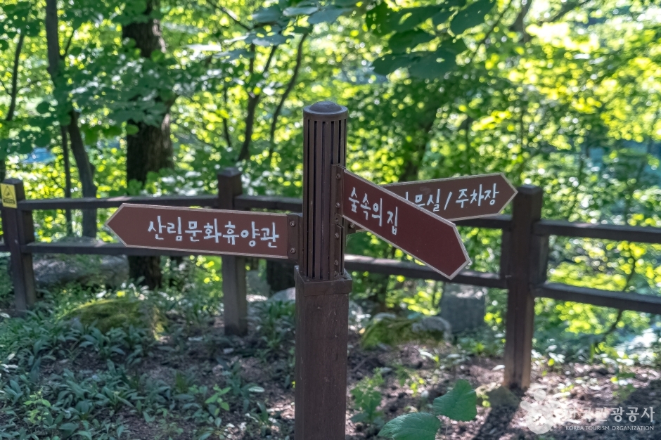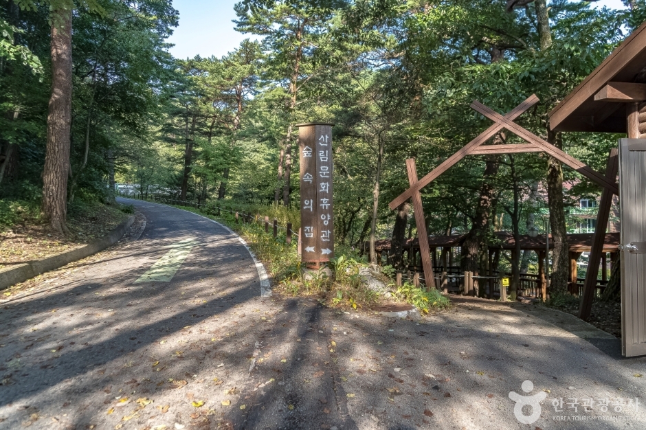 대관령 휴게소                                 국립대관령자연휴양림 영동과 영서 지방을 가르는 분수령인 대관령 정상에서 동쪽으로 바라보면 강릉시와 동해바다가 한눈에 보이고, 발아래는 아름드리 소나무 숲이 융단처럼 펼쳐지는데, 이 속에 대관령 자연휴양림이 있다. 한국에서 최초로 개장한 휴양림으로 1989년 2월 15일에 문을 열었고 면적은 2,808만 제곱미터이고, 1일 최대 수용 인원은 1,000명, 최적 인원은 500명이다. 대관령자연휴양림은 태고의 웅장함을 그대로 갖춘 우리나라 제일의 소나무 숲으로, 각종 편의 시설과 소나무 숲이 조화를 이루어 가족단위 휴식 및 산림욕을 즐기기에 최적의 휴식공간이다. 강릉시가 가까워 이곳을 거점으로 경포대와 오죽헌 등 강릉 부근 역사 유적지 여행을 곁들여 바다경치를 구경할 수 있다. 맑은 날이면 짙은 야경이 휘황찬란하다. 휴양림은 2지구로 나뉘는데 왼쪽 계곡에는 단체를 위한 수련장 시설이 오른쪽 계곡에는 가족단위 위락시설들이 있다. | |