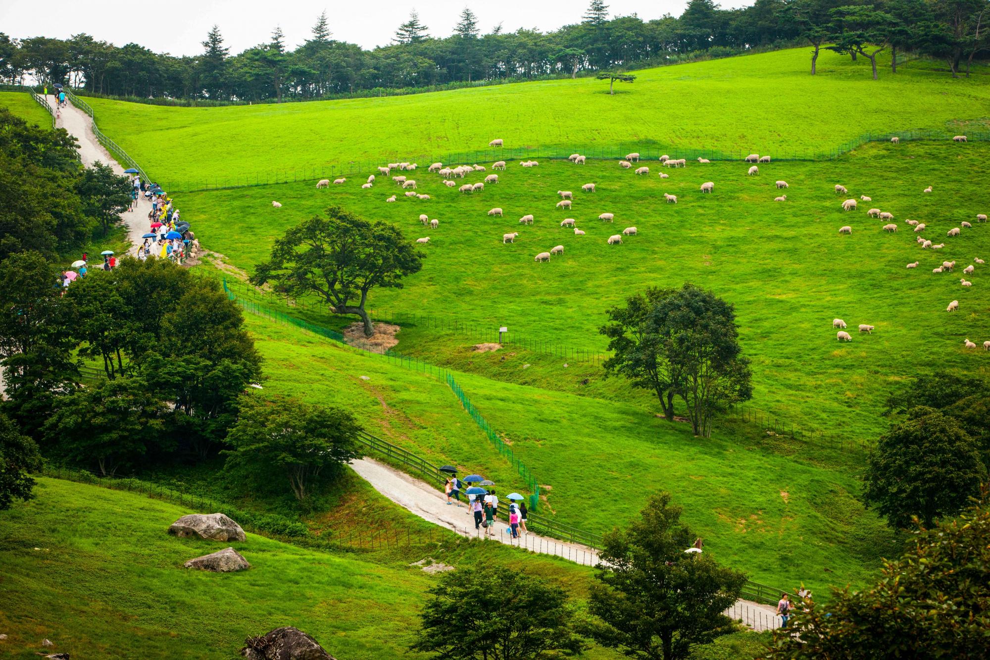 양떼목장                                 대관령양떼목장 한국 농림부에서 지정한 동물복지와 산림보존에 특화된 목장이다. 20만 5,000㎡의 넓은 초지에 양들을 자유로이 방목한다. 1989년에 첫 축사를 완공하고 1991년에 면양을 들인 목장은 오늘날 면양 사육에 관해 한국 최고 수준의 시스템을 갖춘 목장으로 성장했다. 대관령 양떼목장에서 즐길 거리는 크게 두 가지, 산책로 걷기와 먹이 주기 체험이다. 목장을 에두르는 1.2km 길이의 산책로는 40분가량이 소요된다. 야생식물이 자라는 산책로를 걸으며 초지에서 풀을 뜯는 양 떼를 만날 수 있다. 참고로 양은 초지 풀이 자라는 5월 중순~10월 말에 방목되고, 겨울에는 축사 안에서 생활한다. 산책로 초입에는 SNS 포토존으로 유명한 나무 움막이 있고, 산책로 중간 지점이자 목장 정상인 해발 920m에서 바라보는 백두대간은 막힌 가슴을 시원스럽게 한다. 산책로 마지막 코스인 먹이 주기 체험장에서는 축사 안의 양에게 건초를 줄 수 있다. | |
