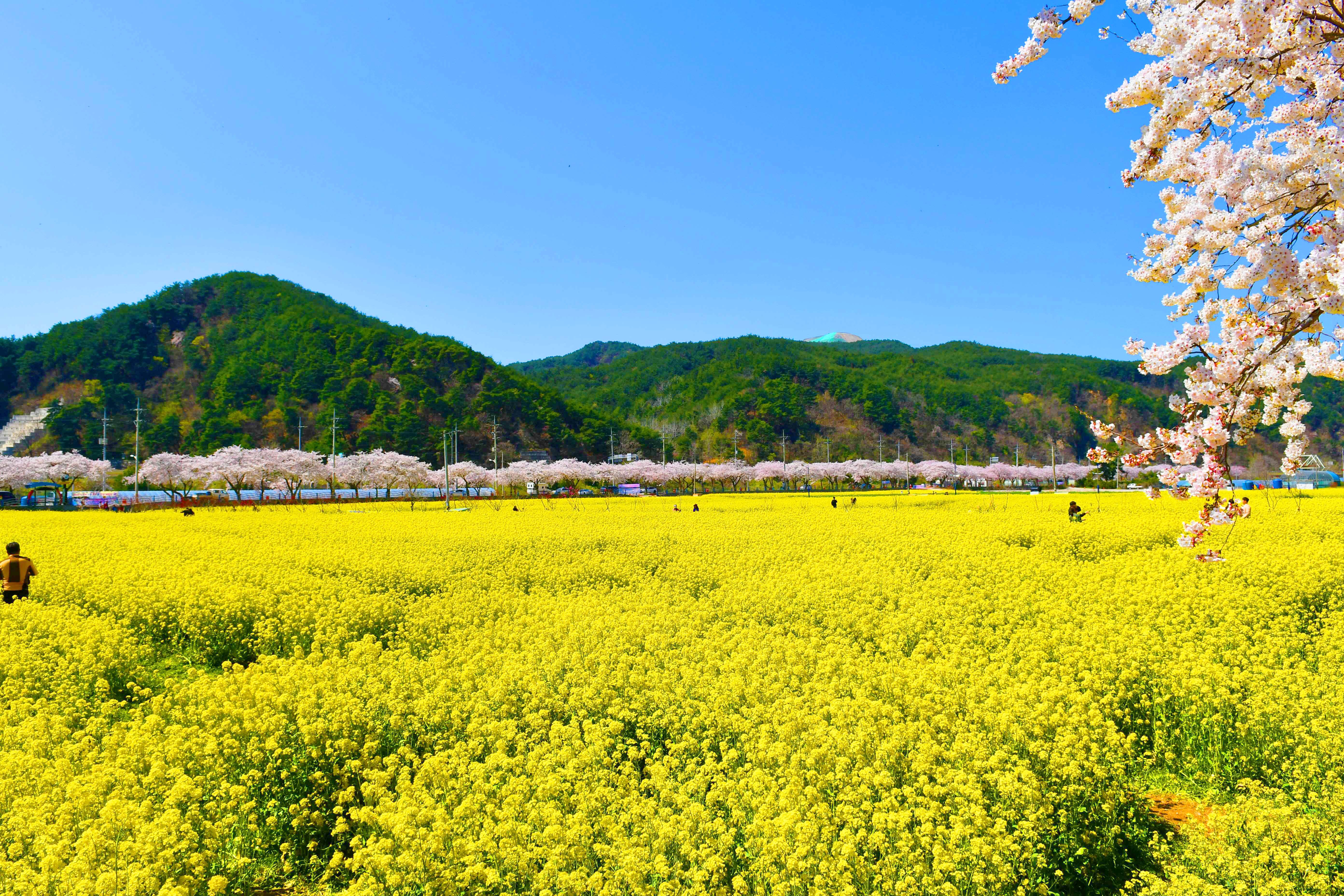 강원도 삼척시 근덕면 상맹방리는 국도 제7호선을 따라 이어지는 벚꽃길과 그 옆에 펼쳐진 넓은 유채꽃밭이 어우러져 봄마다 아름다운 풍경을 자아내는 곳이다. 오래된 벚나무 아래를 따라 흐드러지게 피어나는 벚꽃과 노랗게 물든 유채밭은 조화를 이루며, 지나는 이들의 발길을 멈추게 한다. 유채꽃은 매년 4월 중순경 절정을 이루며, 벚꽃길은 한재밑에서 교가리까지 약 4km, 유채밭은 약 7.2ha 규모로 조성되어 있다. 바다와 꽃이 함께 어우러지는 풍경은 사진 찍기 좋은 명소로, 특히 일몰 무렵 석양과 유채꽃이 만들어내는 장관은 많은 이들에게 잊지 못할 봄날의 추억을 선사한다. 인근에는 맹방해수욕장, 레일바이크, 해신당공원, 이사부사자공원 등 다양한 관광지가 있으며, 유채꽃마을에서는 계절에 맞춘 딸기 수확 등 농촌 체험 프로그램도 운영되고 있다. 매년 4월에는 이곳에서 ‘맹방 유채꽃 축제’가 열려 봄의 정취를 더한다.