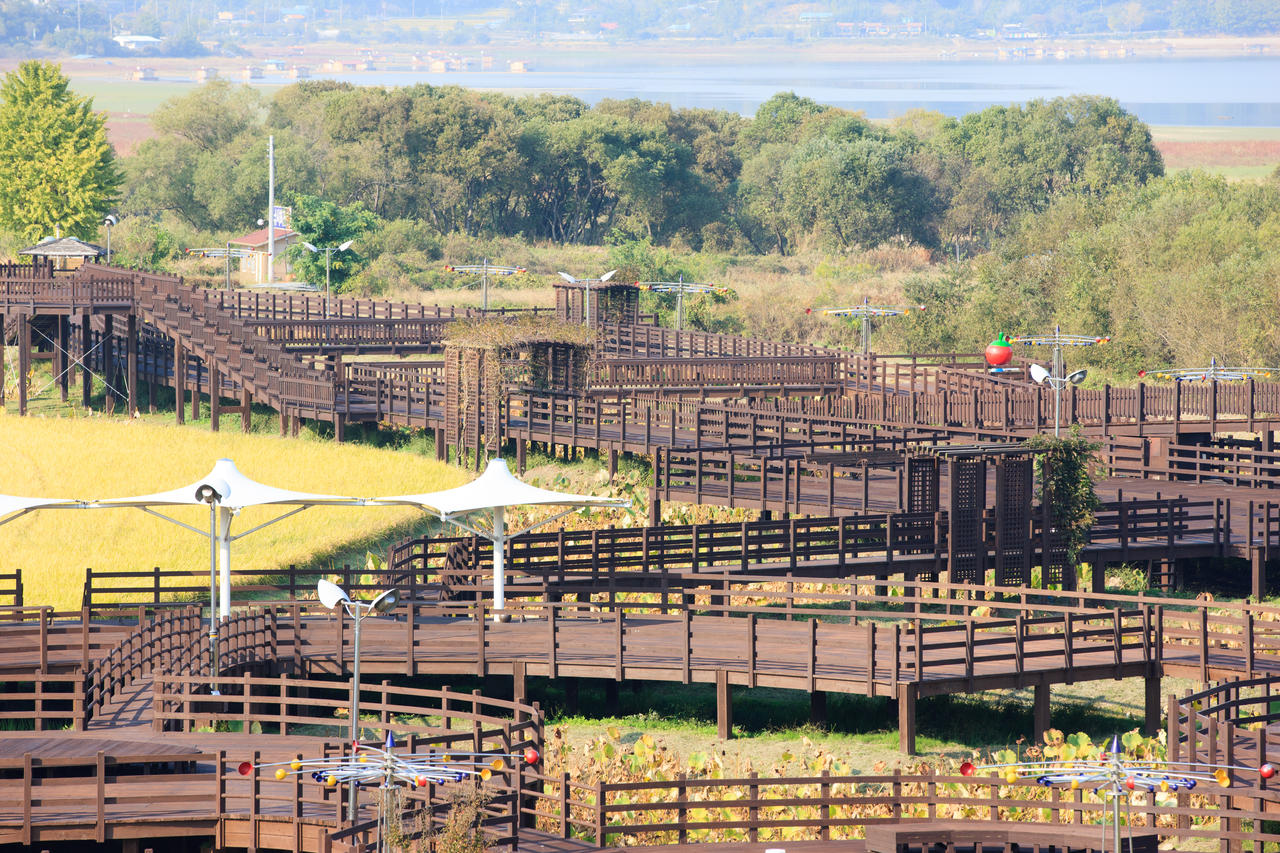 우리나라에서 가장 큰 저수지인 예당호에 위치한 예당호 출렁다리는 예산군의 새로운 대표 관광지 중 하나로 402m의 길이를 자랑하고 있다. 하늘로 곧게 솟은 64m 주탑을 중심으로, 양옆으로 펼쳐진 케이블은 아름다운 자태의 거대한 황새가 길고 흰 날개를 펼쳐 호수 위를 비상하듯 환상적인 풍경을 자아낸다. 음악 분수는 길이 96m, 폭 16m, 최대 분사 높이 110m에 다다르는 부력식 분수이며, 그러데이션 기법을 적용한 형형색색 LED 불빛을 이용한 공연이 몽환적인 분위기를 자아낸다. 출렁다리 주변에는 야영장, 공연장, 족구장 등 각종 부대시설이 있으며, 조각공원과 저수지 경관을 즐기며 거닐 수 있는 산책로가 있어 많은 관광객에게 주목받고 있다.