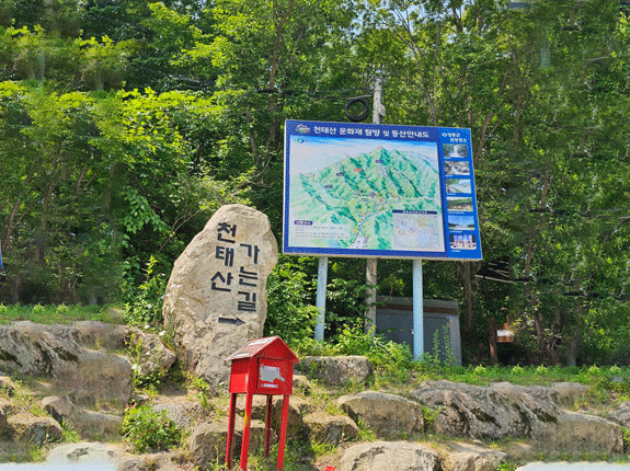 천태산 입구 천태동천의 청아한 물소리를 들으며 진주폭포와 삼단폭포(옛 용추폭포)를 지나면 영국사 입구가 나온다. 조금 더 길을 걸으면 1,000여 년 동안이나 이산을 지키고 있는 영국사 은행나무의 뛰어난 자태를 엿볼 수 있다. 높이 31m 둘레가 11m 정도 되고 가지 하나가 땅에 뿌리를 내리고 독립된 나무처럼 자라고 있다. 이 은행나무 아래에서 등산로가 갈리고 영국사에서 1시간 30분 정도 오르면 정상에 도착한다. 서쪽으로 서대산이, 남쪽으로는 성주산과 그 너머 덕유산이 보인다.